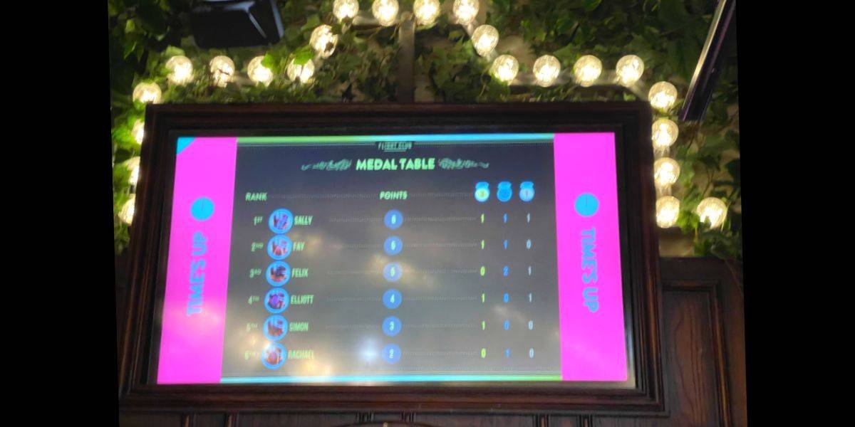 As a group we had a dedicated host – a Gamesmaster - who showed us to our own semi-private oche and got us all set up for 90 minutes of fun! It was a world apart from darts down at the local pub. There is state-of-the-art tech here, the world’s first darts vision system which actually detects the darts as they hit the board and displays the score immediately on a screen directly above.