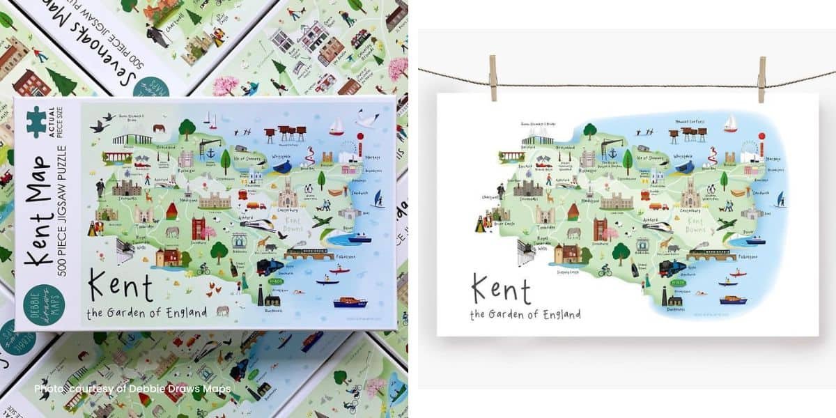 Celebrate all things Kent with Debbie Draws Maps’ beautiful illustrations of local areas. From Sevenoaks, Debbie put her graphic design skills and passion for drawing to good use during lockdown and now creates a range of gorgeous art prints, tea towels, magnets, coasters and puzzles highlighting some of her favourite parts of Kent.
