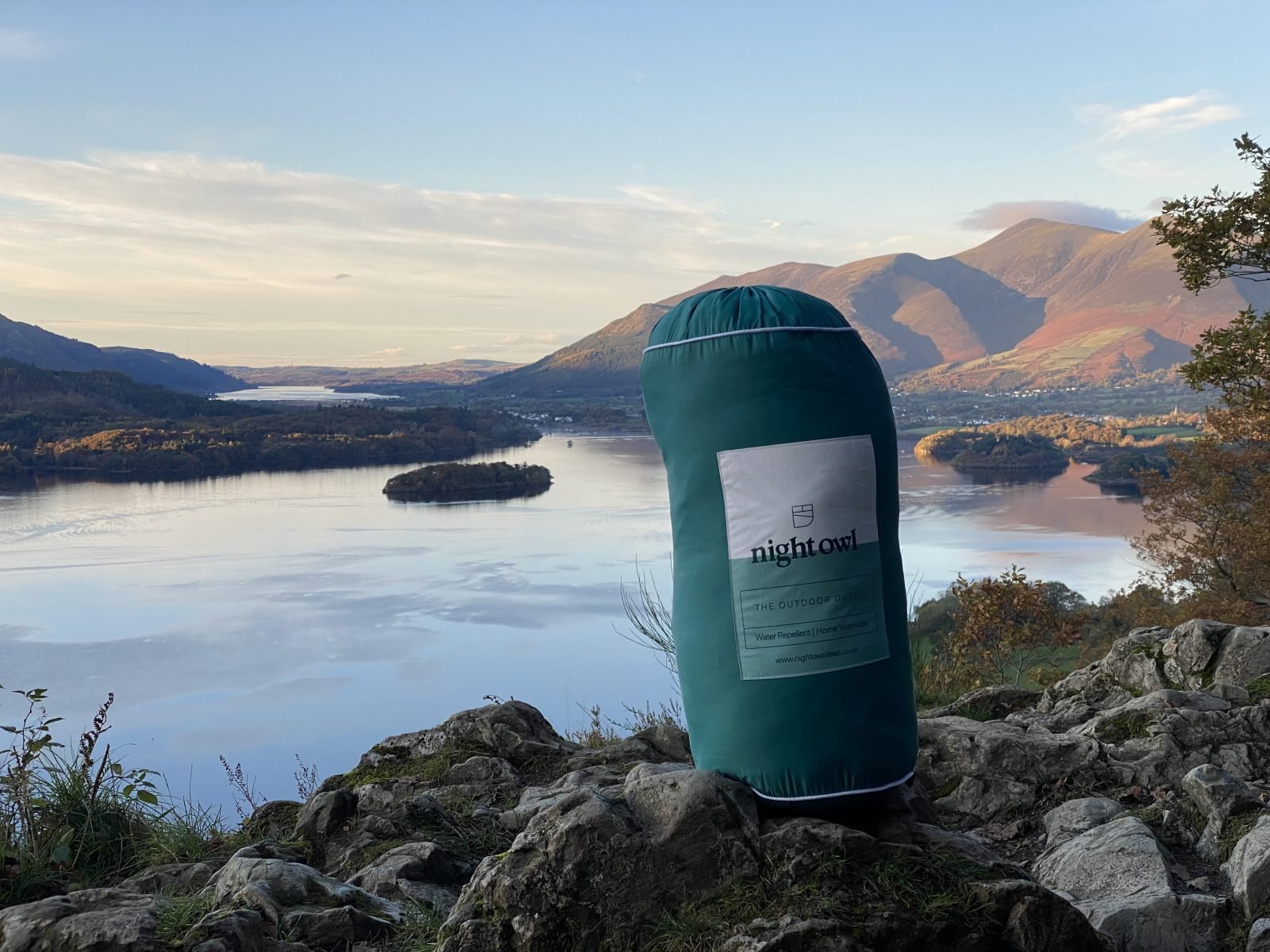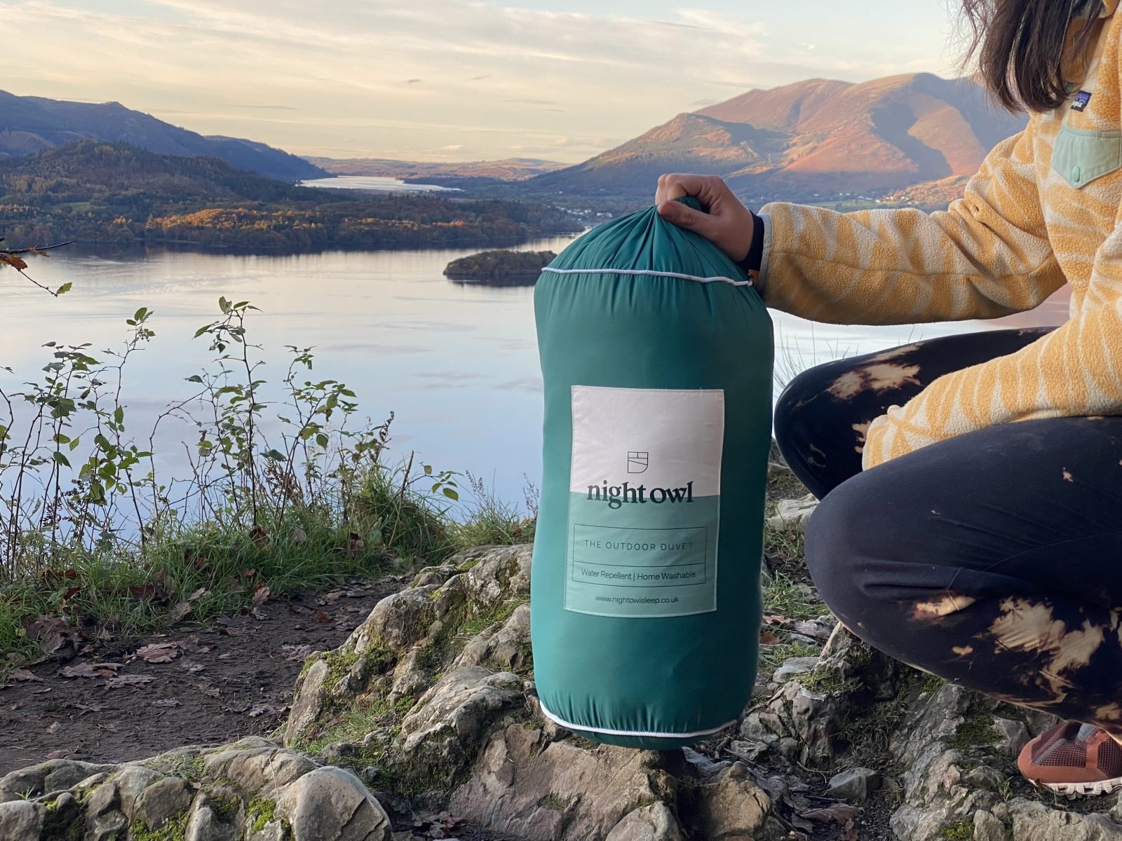 The Fine Bedding Company Night Owl Outdoor Duvet is a packable, warm, portable and sustainable outdoor duvet that you can cosy up under around the fire, out camping, with friends or relaxing at one of the great sunset spots in The Lake District.