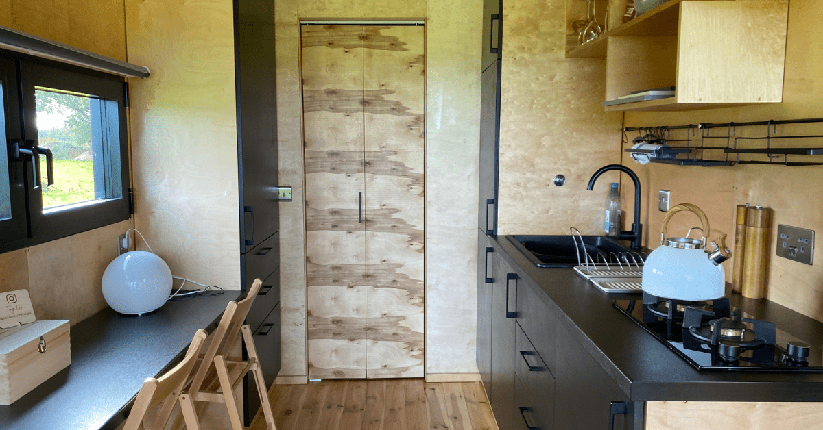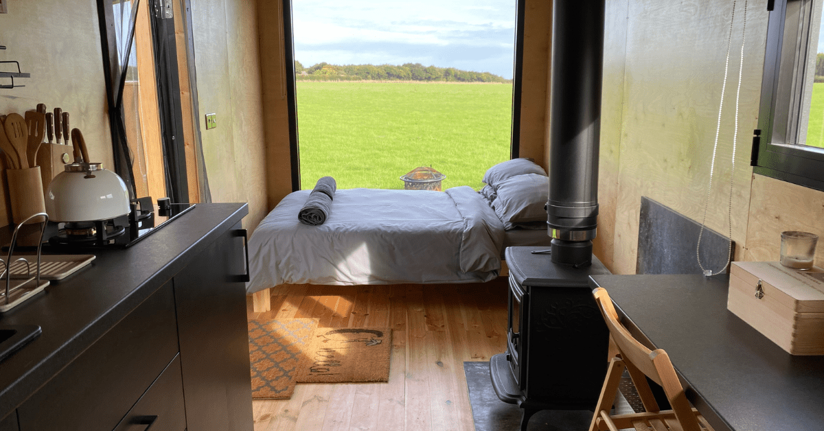 Inside the cabin was a comfortable double bed, sat right in front of the large window - positioned for the best view of the sunrise. The kitchen is equipped with a gas stove and kitchen equipment, as well as coffee and tea-making facilities.