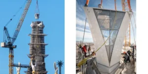 This week the upper arm of the cross was put in place on the tower of Jesus Christ at the Sagrada Família, a milestone that completes works on the exterior of this tower. In 2027 and 2028, works will continue inside the structure.