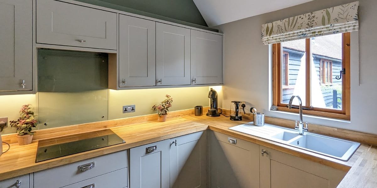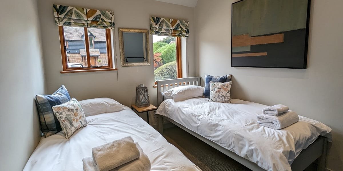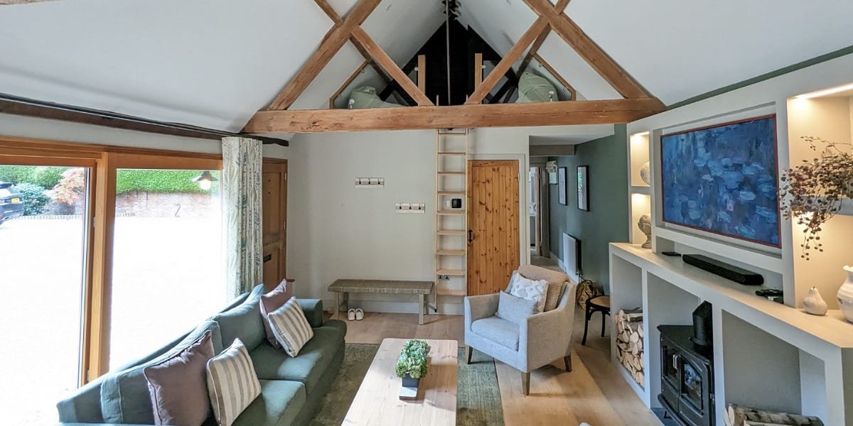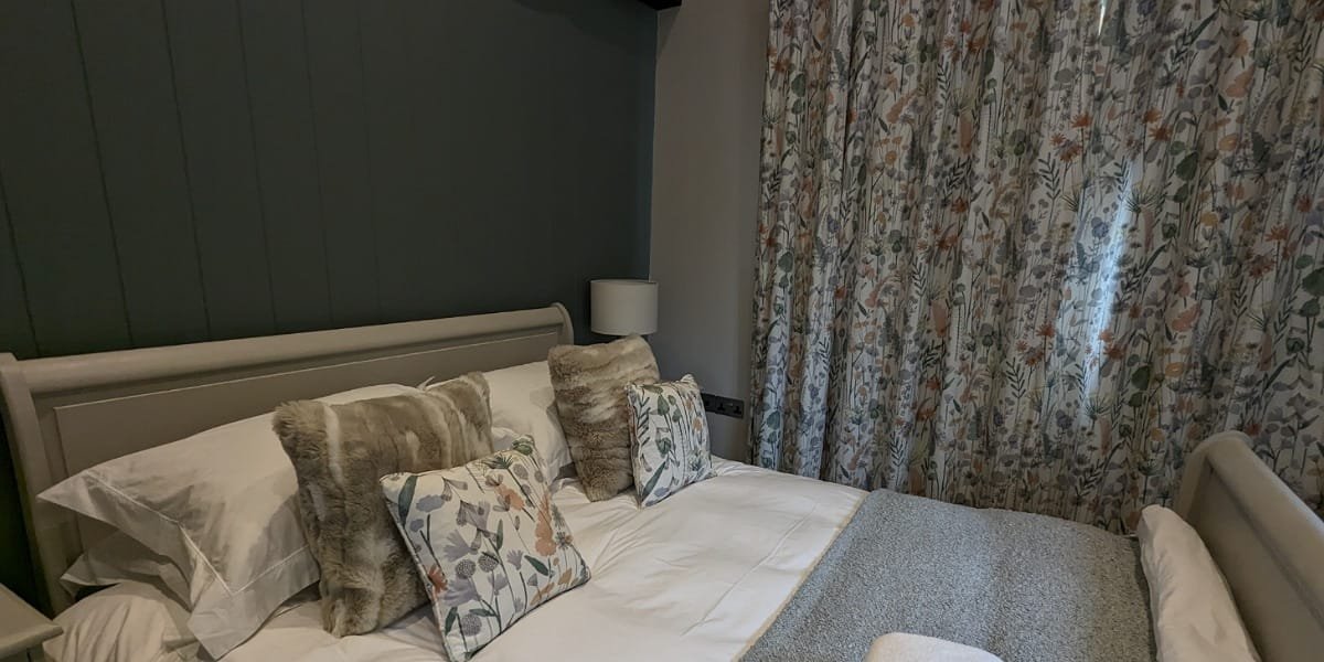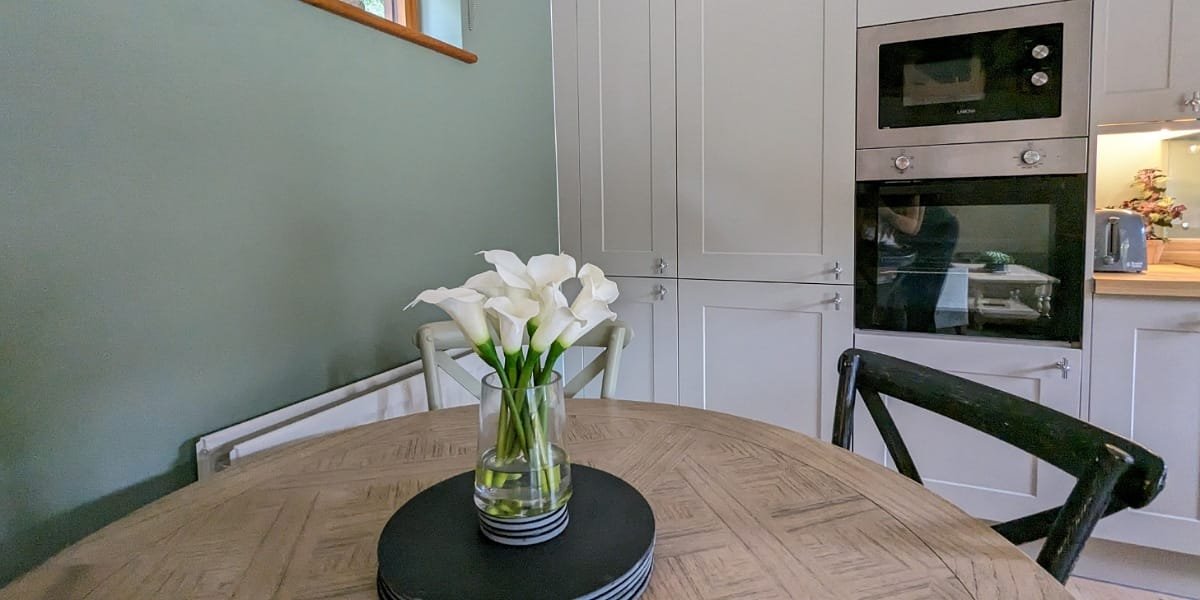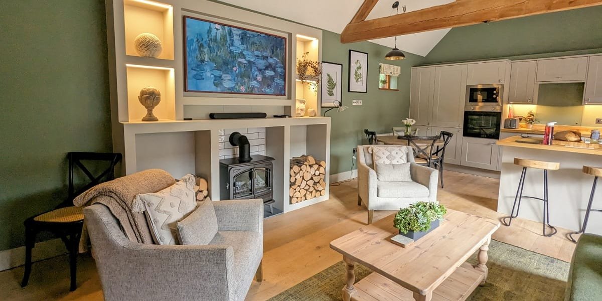 The decor is a calming mix of greens and neutrals, expertly chosen by owners Ben and Julie (and a talented interior designer). This barn conversion was completely renovated in early 2023 and has been furnished to a high standard. The quality kitchen has everything you need for a short break with home comforts like a washing machine and dishwasher.