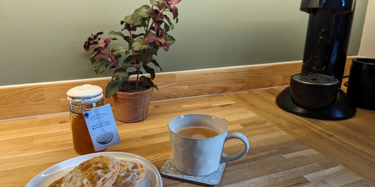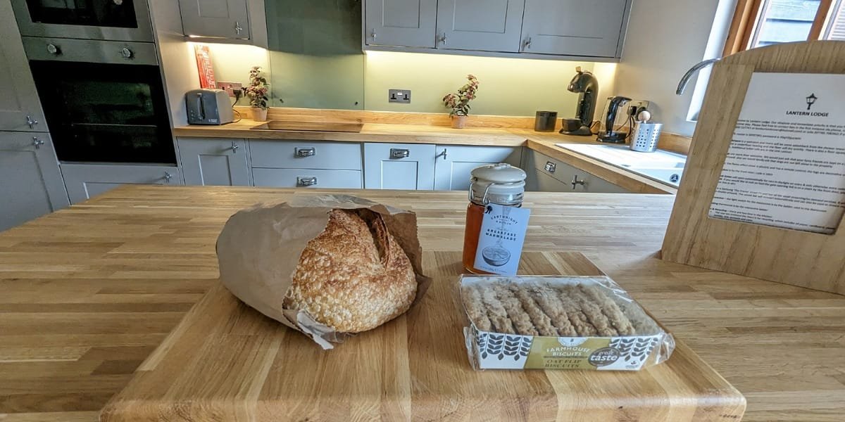 A welcome basket is kindly provided, with an excellent sourdough loaf from the local Wellington Farm Shop and the marmalade was perfection. If you’re staying in the warmer months then you’ll also find a complimentary bag of charcoal for the BBQ on the decking outside. There’s a seating area in the courtyard which catches the evening sun.