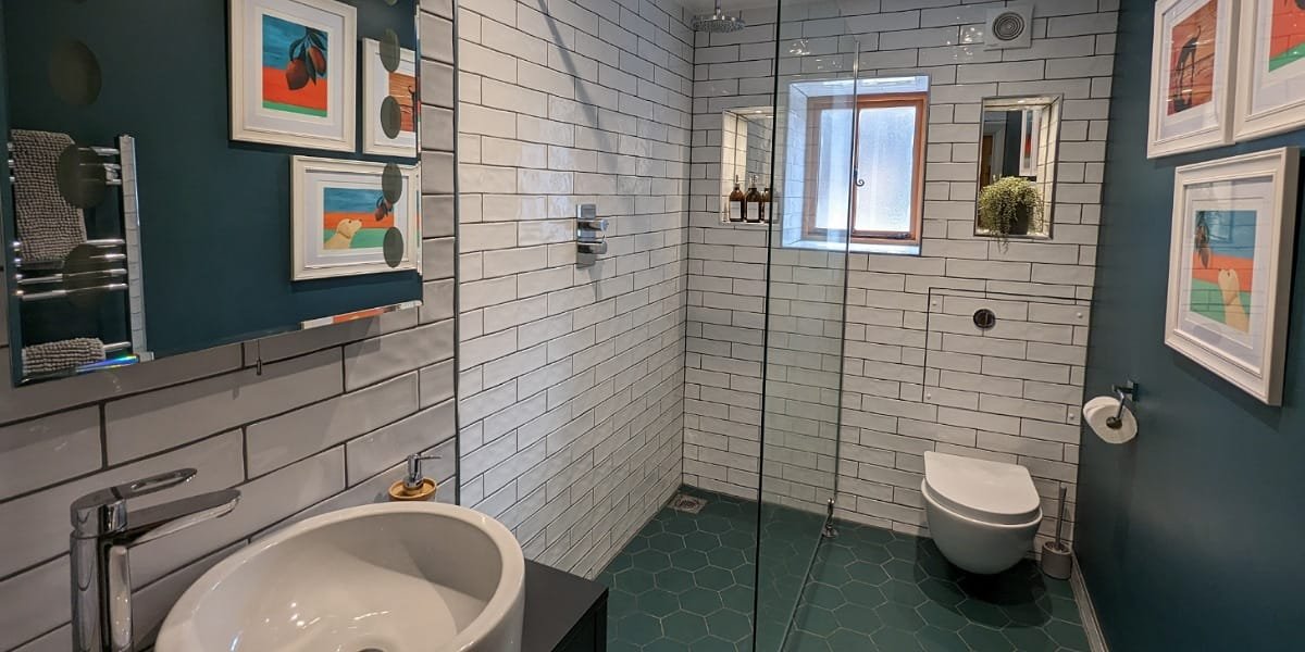 The wet room and toilet have been decorated beautifully in teal, with hexagonal floor tiles that I’d love to have in my own house. There’s a floor squeegee (did not know they existed!) to help keep it dry. Shampoo, conditioner and shower gel are all provided.