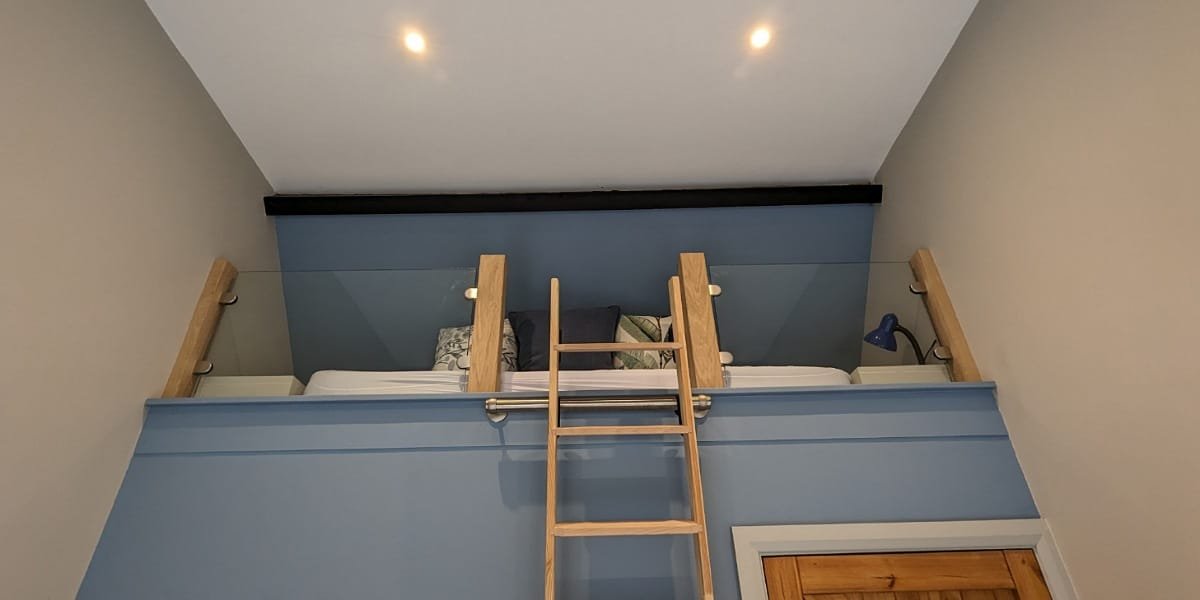 The second bedroom has a quirk of its own in that it also has a mezzanine level, just big enough for a single bed and a lamp. If you are bringing more than one child I could imagine them fighting over who gets to sleep up the ladder. There are also 2 other single beds and a clothes rail in this room.