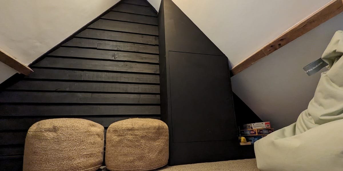 In the living area, a stove can be used for heating, though I just turned on the decorative fire effect, creating a warm and cosy atmosphere. The sofa was very comfortable and I found the TV easy to use, particularly with Disney+ already being logged in. The living room also features a mezzanine level with beanbags and a bookshelf with some family games. I can tell from reading the reviews of Lantern Lodge that kids absolutely love this quirky space. It’s a great area for them to chill out without them having to retreat to the bedroom.