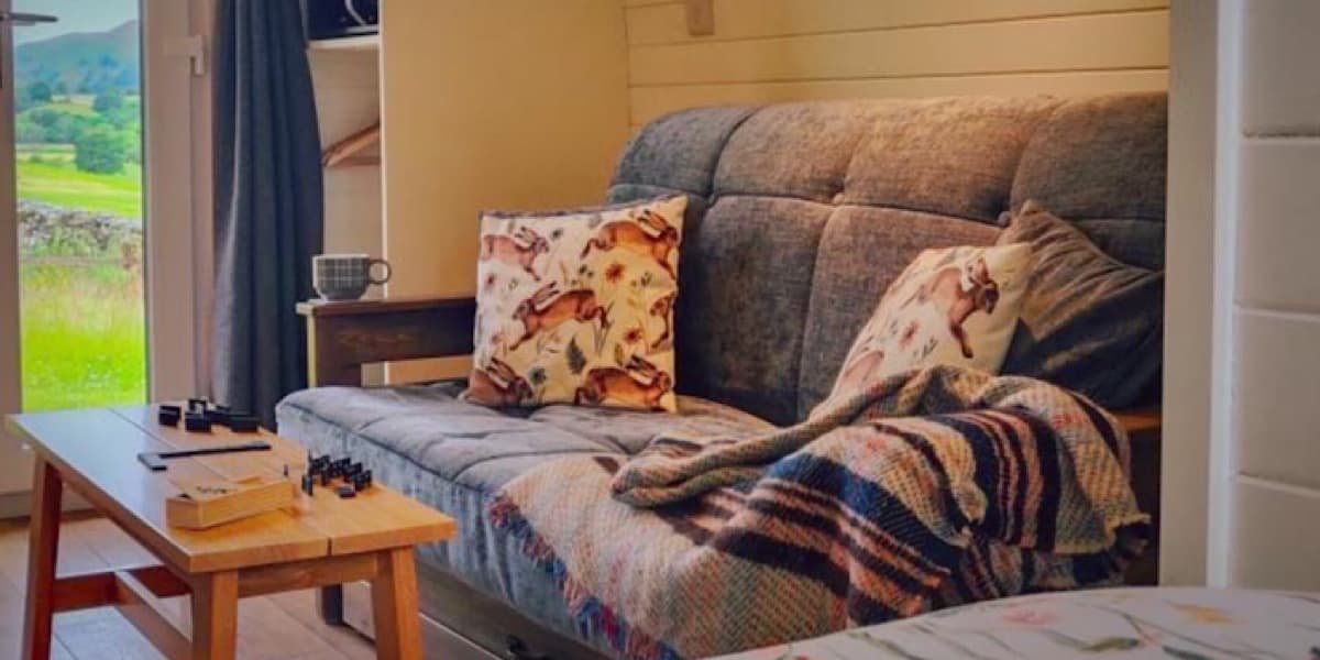 There are 2 glamping pods on the farm; Elbolton and Skelterton named after the local Cracoe Reef Knotts. Each one super cosy, with an en-suite bathroom, double bed, fully equipped kitchenette, sofa bed, TV, WIFI and more including secure bike storage. The pods can sleep up to 4 people (2 adults and 2 children) so perfect for a family getaway.