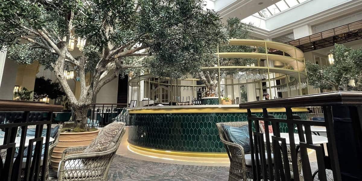 The revamp included a huge refurbishment of the foyer which is absolutely beautiful – picture a round bar with luscious green tiling, accentuated with gold detailing and surrounded by large trees and botanical soft furnishings. Pretty wicker seating reminds you that the foyer is beneath a large glass atrium ceiling, through which you can see the original patterned brickwork of the hotel walls above.