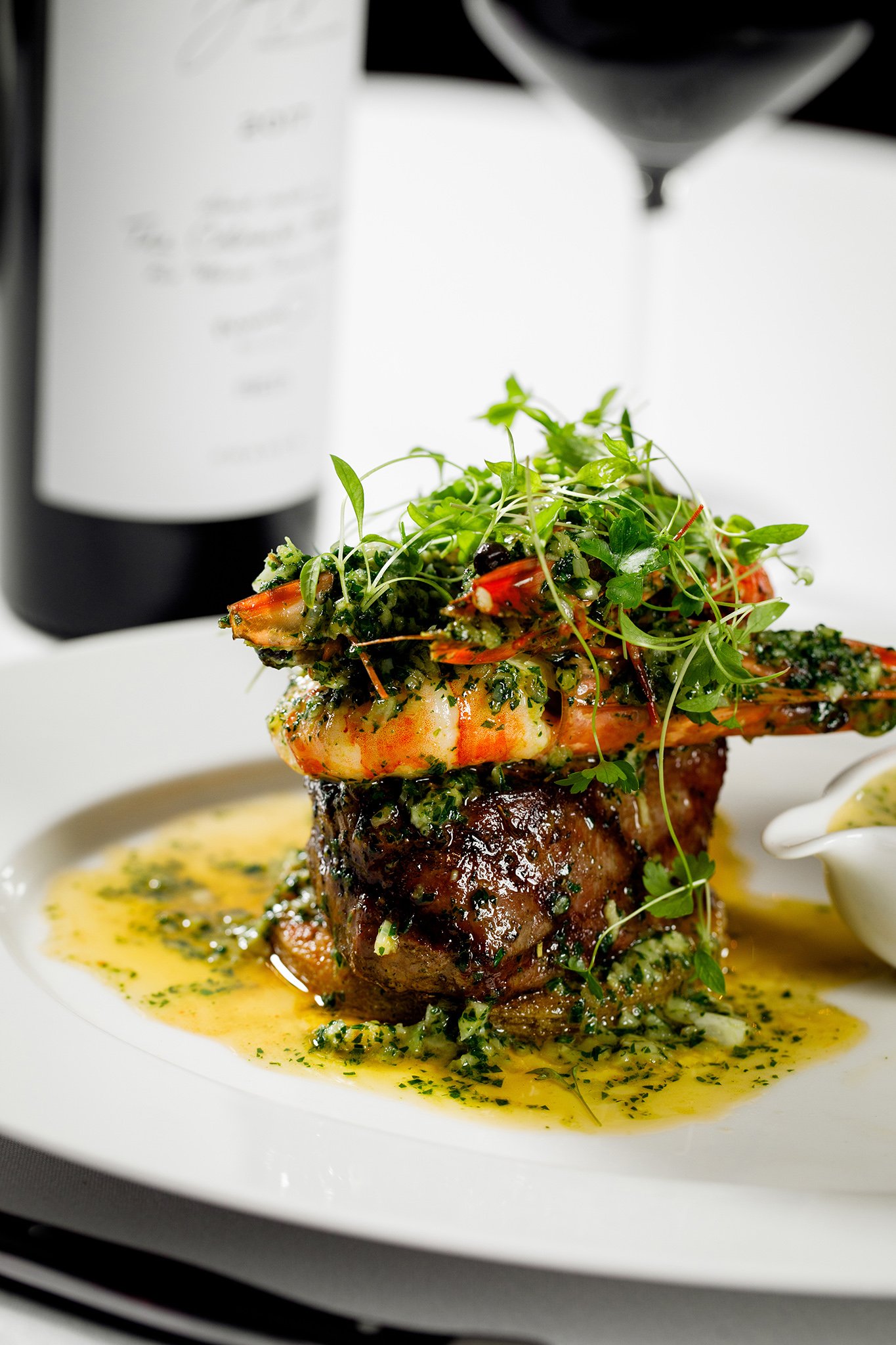 We started with ‘Mr White’s Scotch Egg’ with ‘Colonel Mustard’ sauce – cooked to perfection according to my other half. I had the beetroot & goat’s cheese salad with candied walnuts, Merlot vinegar. For mains we obviously both chose steak. And here it is only the finest Campbell Brothers’ fillet on the menu – either served ‘au poivre’, with garlic prawns or with garlic butter. The fillets melted with succulent richness, as all good steak should.