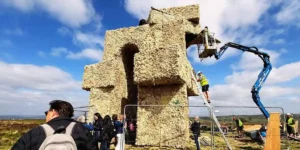 UK-artist Steve Messam has built a 10m high tower exploring the natural building blocks of Bradford, reflecting on how the city of Bradford has been physically shaped by the natural landscape which surrounds it. The tower is inspired by stone drawn from the quarry of the country park and clad in the fleece of local sheep breeds, drawing on the role of wool in the industrial heritage of the district.