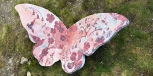 Pakistani-born artist Meherunnisa Asad in collaboration with Peshawar-based atelier Studio Lél, known for reviving centuries-old stone-work techniques, showcases a vast installation contrasting with the rugged terrain of Penistone Hill composed of an abundance of intricate butterflies carved from pink marble sourced from Pakistan, inspired by Bradford’s stories of migration and movement and the resilience of its natural landscape.