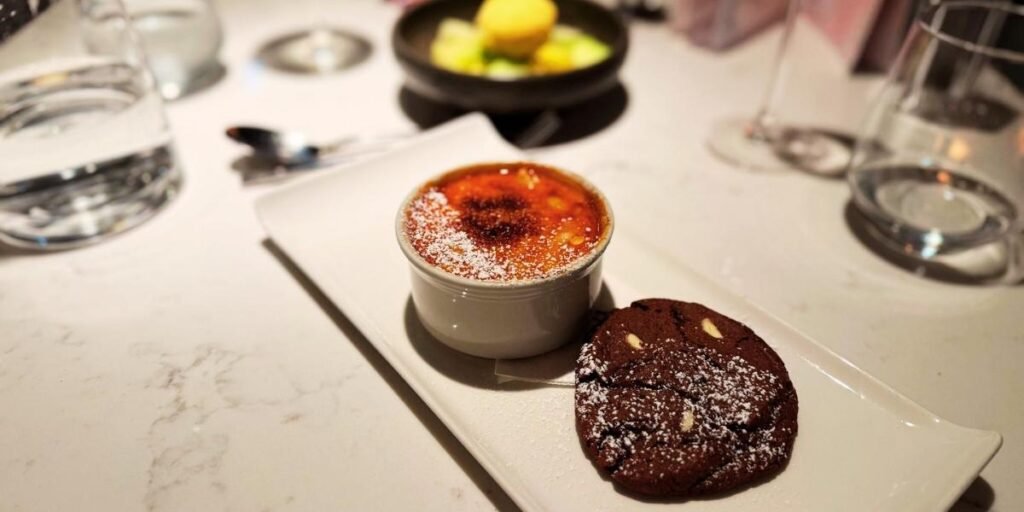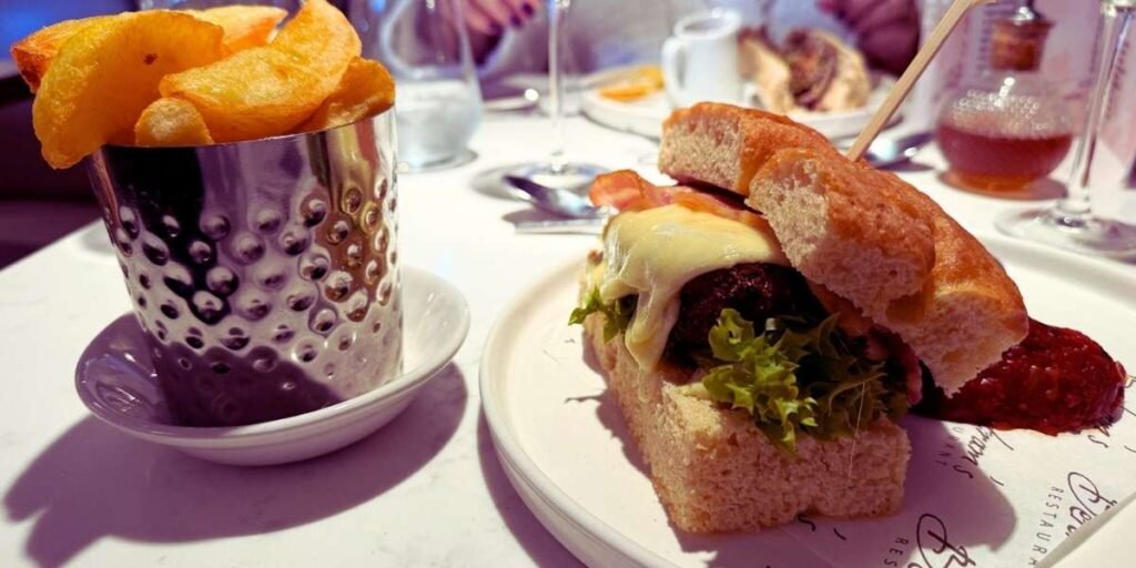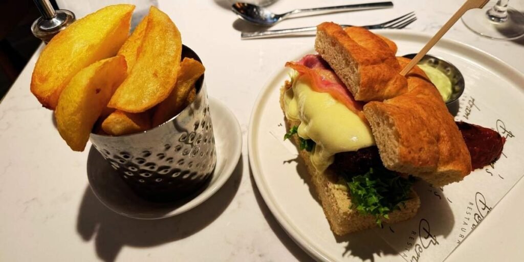 We went for the club sandwich and the hot beef baguette, both with triple-cooked chunky chips. Now I have an appetite, but I could have happily waived dessert— the portions are more than decent. But I’m also not one for turning down a dessert I’ve paid for, so crème brûlée and mango fruit salad later, we were laid in a giant egg trying to stay awake.