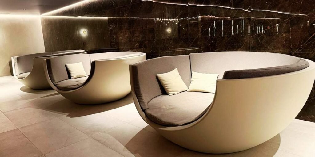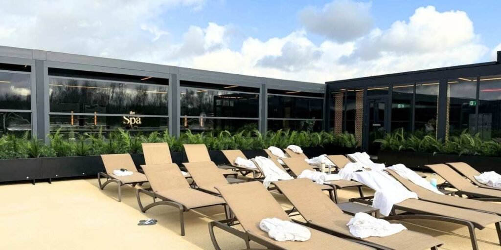 It’s an absolutely stunning high-ceiled room, centred with a pool complete with waterfall fountain and hot tubs in each corner. Along the side of the large space is an ice zone, more foot spas, and another sauna. There are also a number of heated loungers, which were very popular.