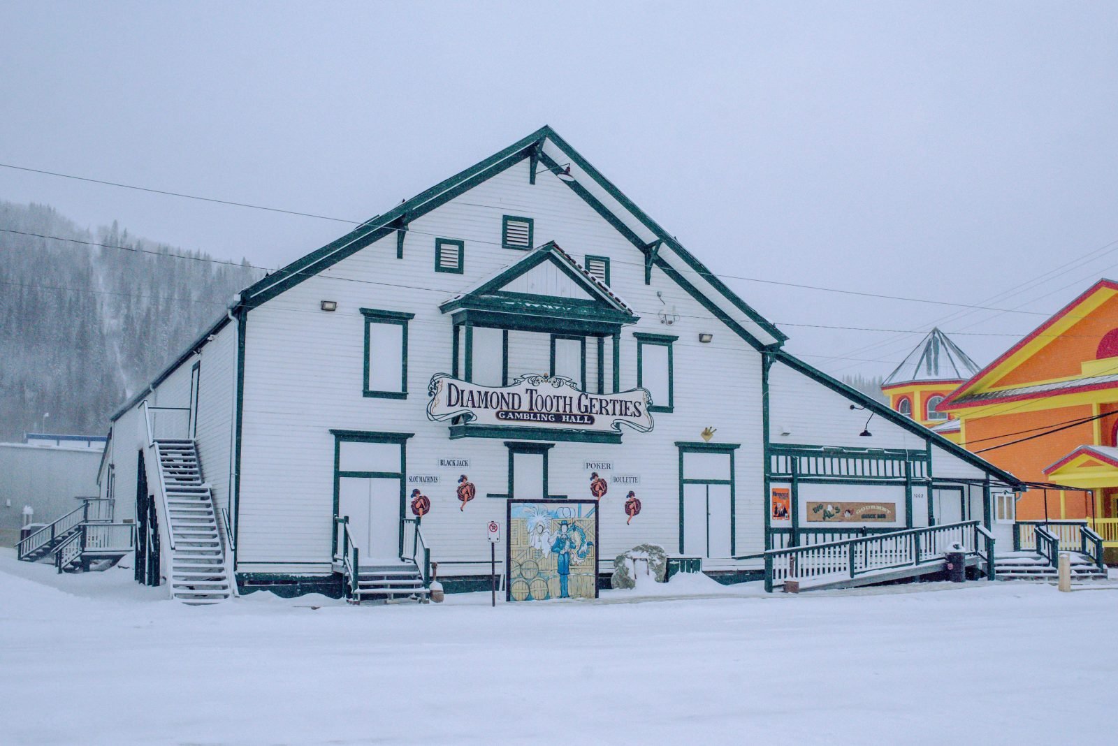 We arrived at Dawson about 6.30 p.m., just as the snow started to fall down heavily. It was quiet – which we had expected - and it felt and looked like we were in a movie set. The buildings are all different shapes and sizes, some leaning and showing their age. We checked into the Downton Hotel, famously known as being the birthplace of the SourToe Cocktail.